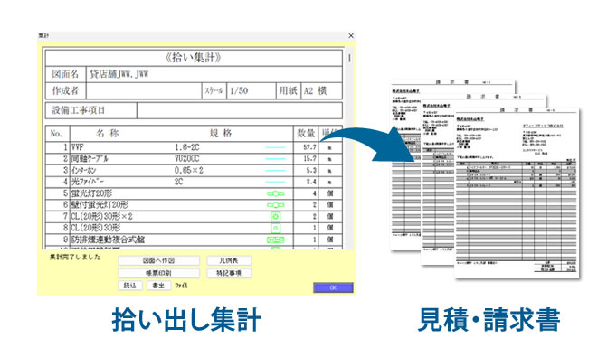 作成した図面から1クリックで材料を拾い出し集計、見積書に連動にします。![]() |