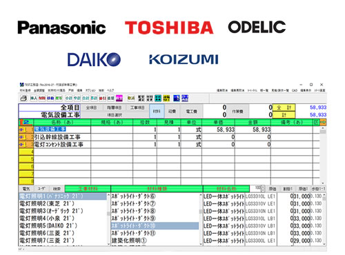 | 材料データ標準装備 | パナソニック、東芝、オーデリック、大光電機、小泉など各電材メーカーの商品が100,000点登録されています。単価データは毎年無料で更新されます。 |